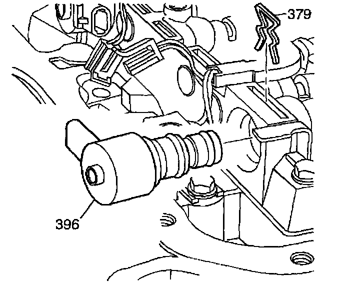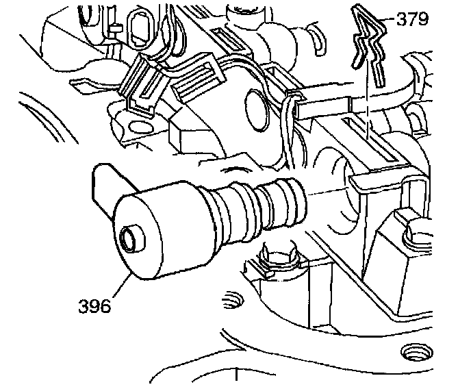 5. Remove the retainer clip (379), torque converter clutch solenoid (396), and the O-ring.
