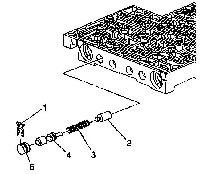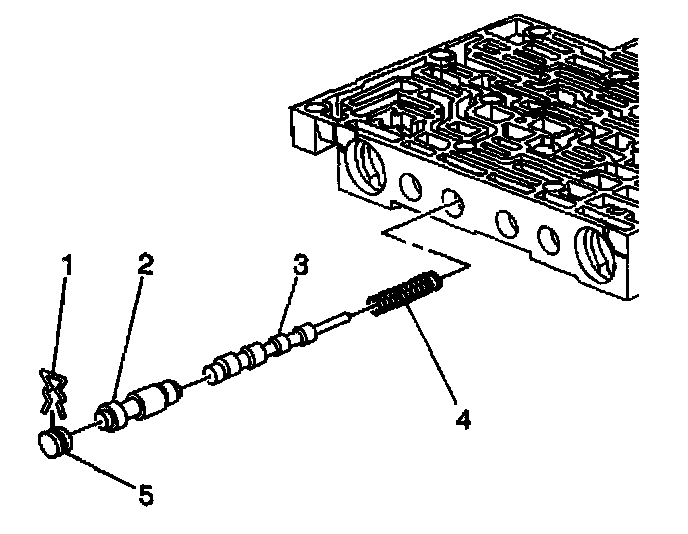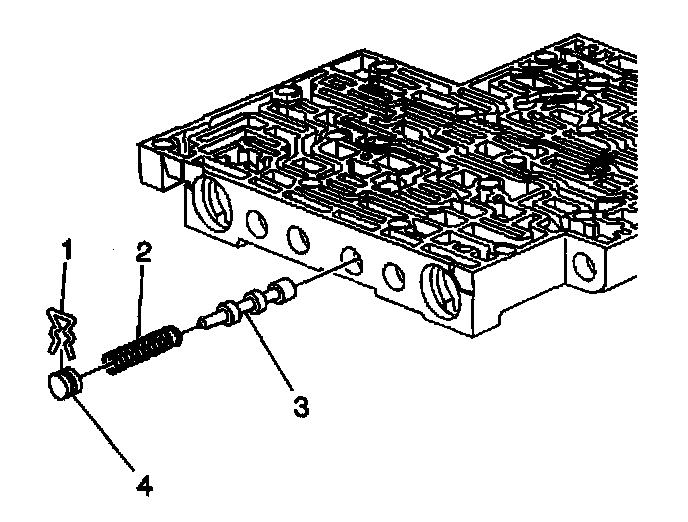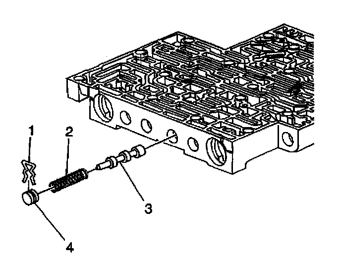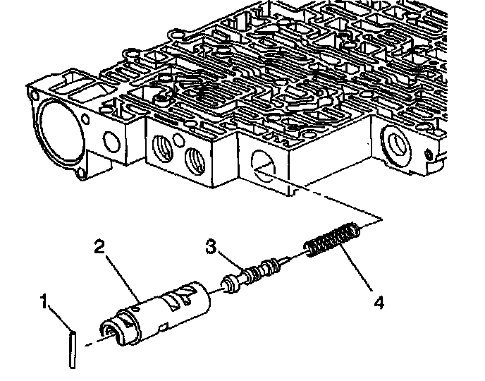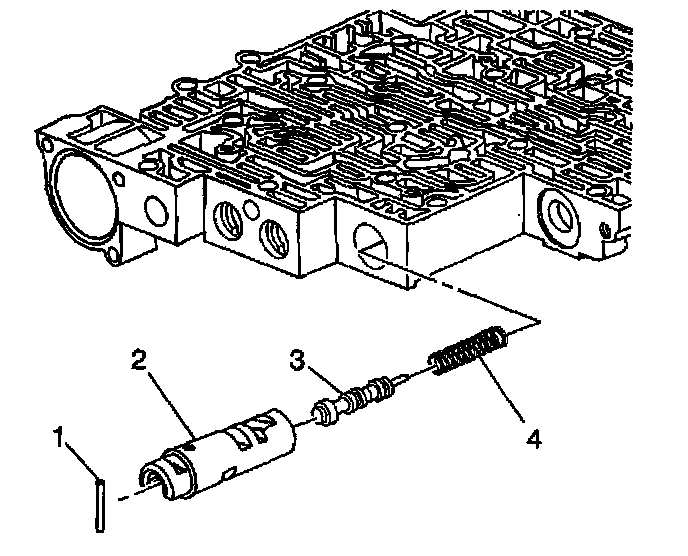 22. Remove the 3-4 relay valve (2) and the 4-3 sequence valve (3) and the 4-3 sequence valve spring (4).