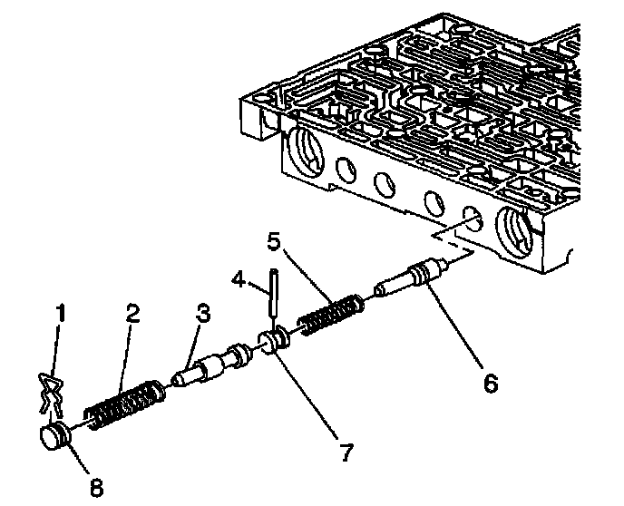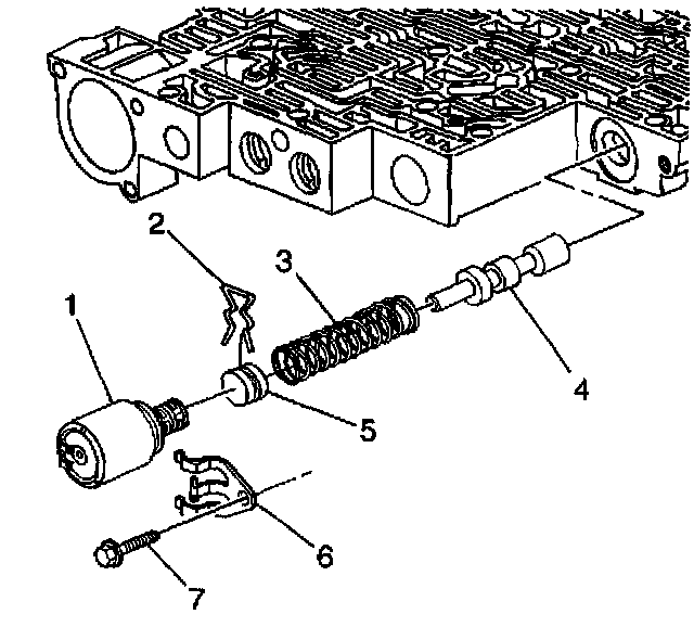 8. Remove the solenoid retainer bolt (7) and the solenoid retainer (6). Remove the pressure control solenoid (1).