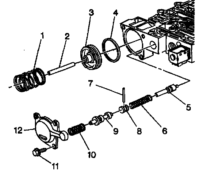 7. Remove the 1-2 accumulator valve (3) and the 1-2 accumulator valve spring (4).