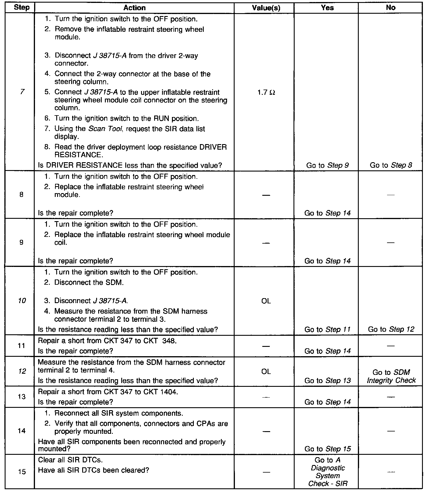 7. This test determines whether the malfunction is due to the inflatable restraint steering wheel module or the module coil.