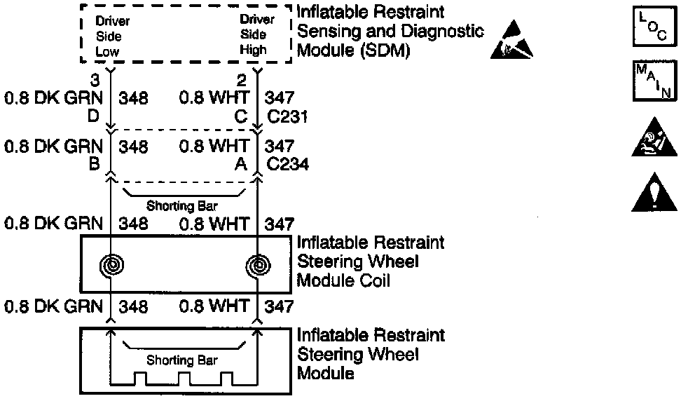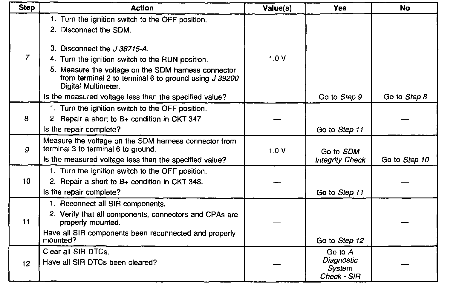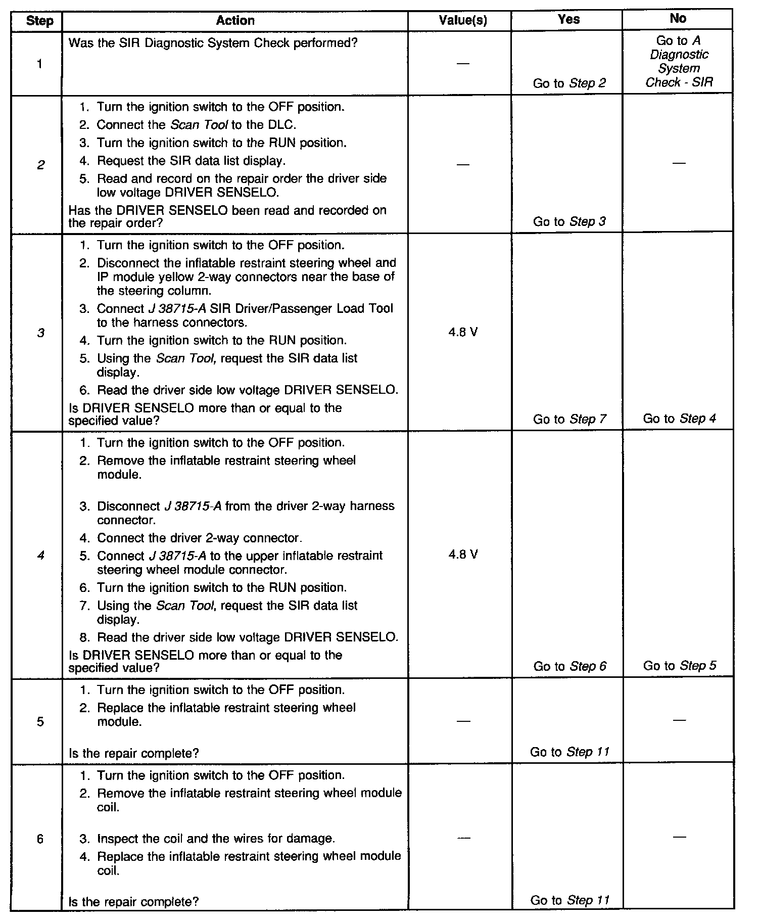 A short to B+ in the inflatable restraint steering wheel module circuit may cause an intermittent condition. Inspect CKT 347 and CKT 348 carefully for cutting or chafing. The diagnostic table directs the technician to note the entry value of DRIVER SENSELO. Comparing the value of DRIVER SENSELO may be helpful in determining if an intermittent condition exists.