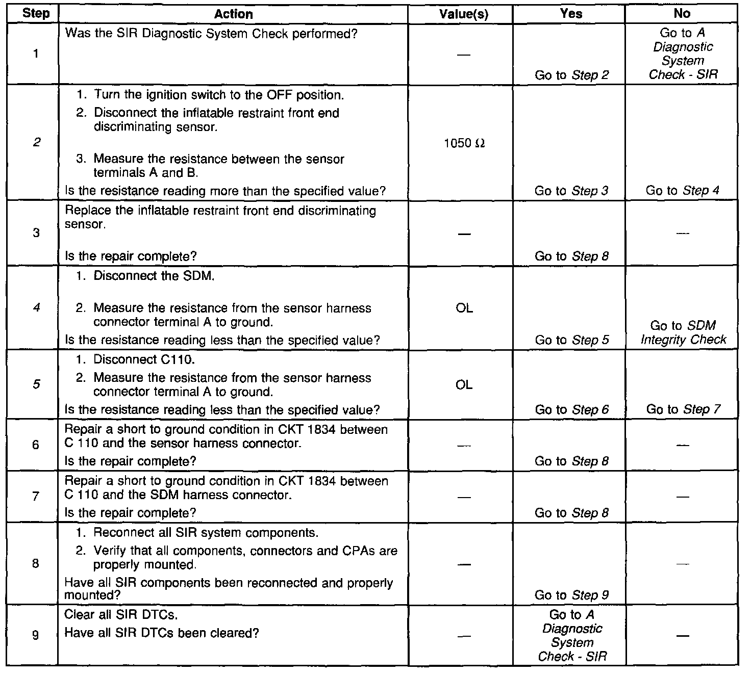 A short to ground in the inflatable restraint front end discriminating sensor circuit may cause an intermittent condition. Inspect CKT 1834 carefully for cutting or chafing.