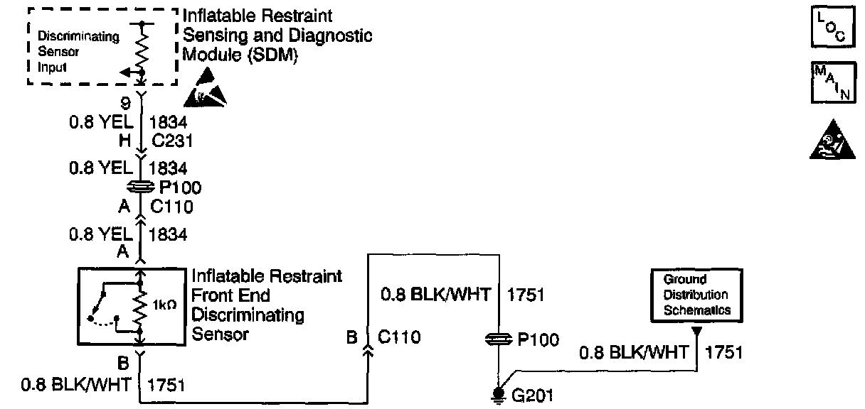 The SDM then proceeds to Continuous Monitoring. The SDM contains a resistor network connected to 5 volts, ground, and to the SDM front end discriminating sensor signal terminal 9. The 1.0 K ohm resistor located in the inflatable restraint front end discriminating sensor is parallel to the normally open switch and provides a parallel path to ground. This causes a specified percentage of voltage to appear at the SDM front end discriminating sensor signal input. The SDM monitors this voltage to detect shorts to ground or a closed discriminating sensor.
