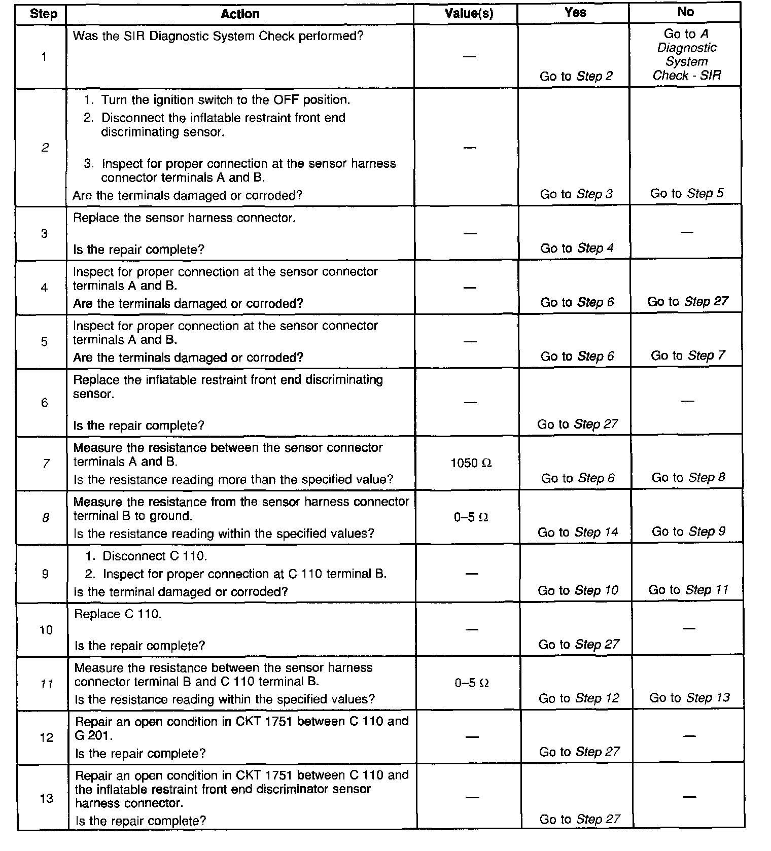 A broken or chafed wire in the inflatable restraint front end discriminating sensor circuit may cause an intermittent condition. Inspect CKT 1834 and CKT 1751 carefully for cutting or chafing.
