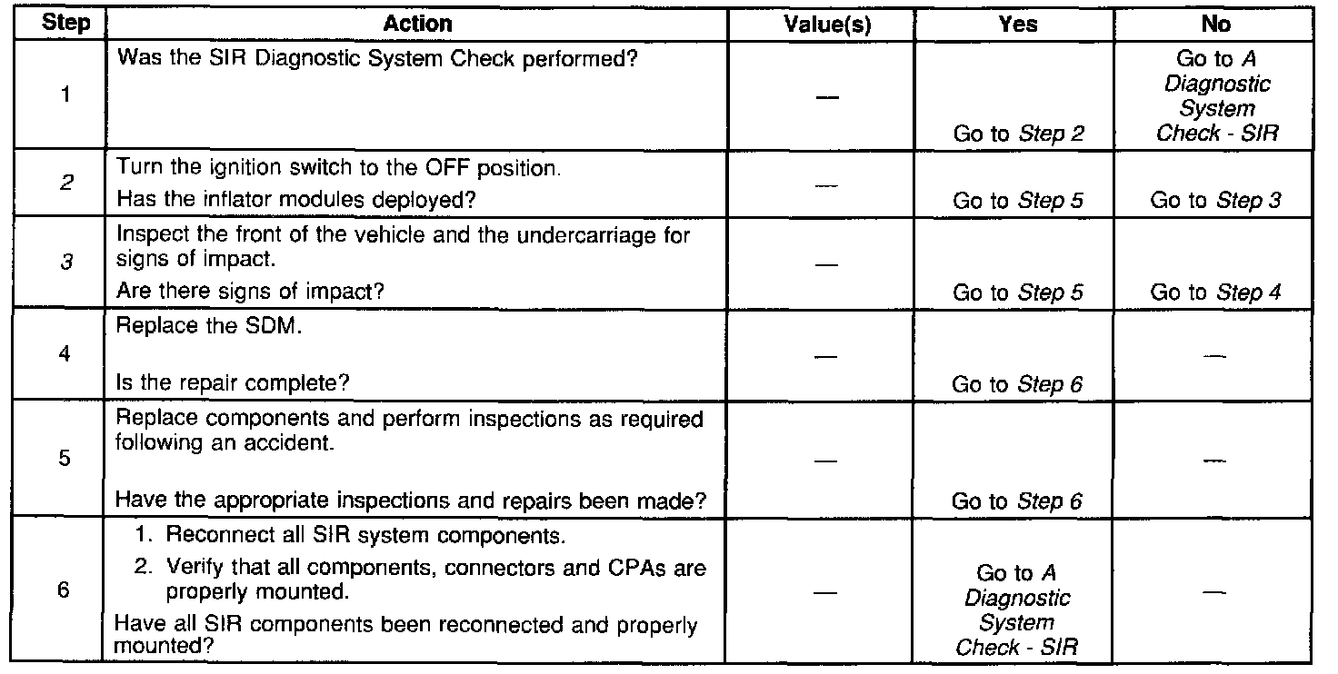 The inflatable restraint Sensing and Diagnostic Module (SDM) contains a sensing device (accelerometer) that converts vehicle velocity changes to an electrical signal. The SDM processes the generated electrical signal and compares the generated electrical signal to a value stored in memory. When the generated signal exceeds the stored value, the SDM performs additional signal processing and compares the generated signals to signals stored in memory. When 2 of the generated signals exceed the stored values, the SDM will cause current to flow through the inflator modules, deploying the air bags. DIG B1053 will set instead of a DIG B1051 when a deployment occurs while an inflator circuit fault is present that could possibly result in a non-deployment situation in one or both inflator modules.