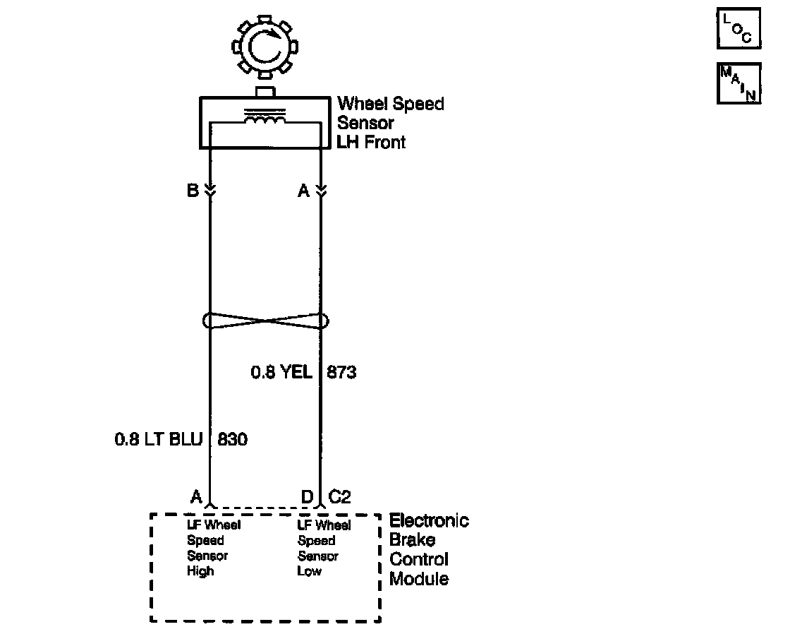 The wheel speed sensor coil emits an electromagnetic field. A toothed ring on the wheel passes by the wheel speed sensor and disrupts this electromagnetic field. The disruption in the field causes the wheel speed sensor to produce a sinusoidal (AC) voltage signal. The frequency and amplitude of the sinusoidal (AC) voltage signal are proportional to the speed of the wheel. The amplitude of the wheel speed signal is also directly related to the distance between the wheel speed sensor coil and the toothed ring. This distance is referred to as the air gap.