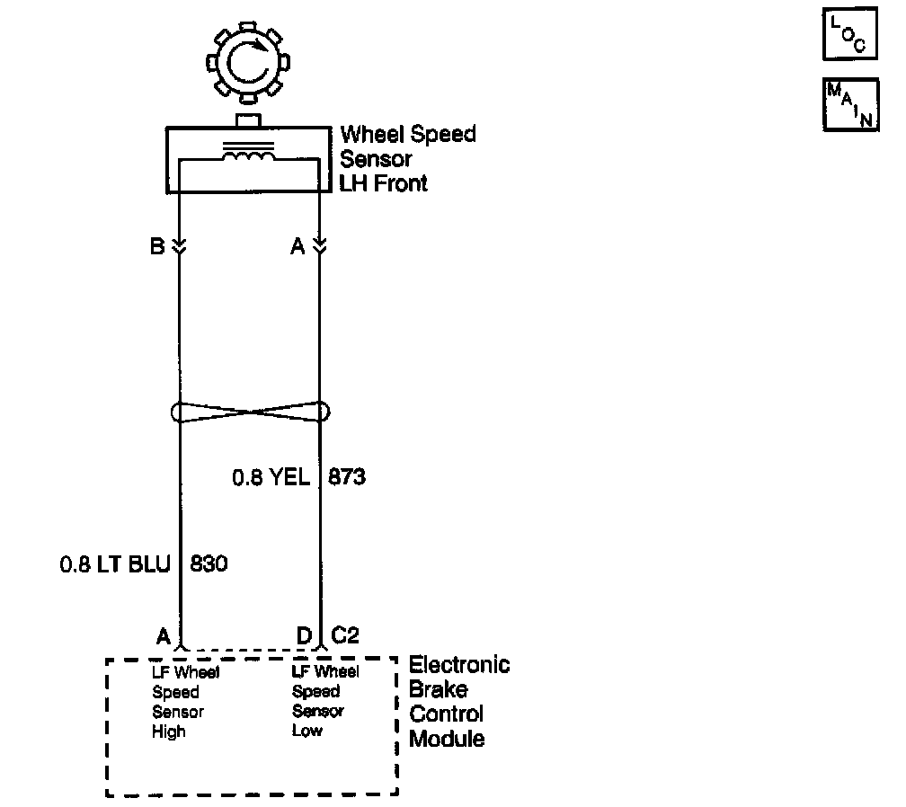 The wheel speed sensor coil emits an electromagnetic field. A toothed ring on the wheel passes by the wheel speed sensor and disrupts this electromagnetic field. The disruption in the field causes the wheel speed sensor to produce a sinusoidal (AC) voltage signal. The frequency and amplitude of the sinusoidal (AC) voltage signal are proportional to the speed of the wheel. The amplitude of the wheel speed signal is also directly related to the distance between the wheel speed sensor coil and the toothed ring. This distance is referred to as the air gap.