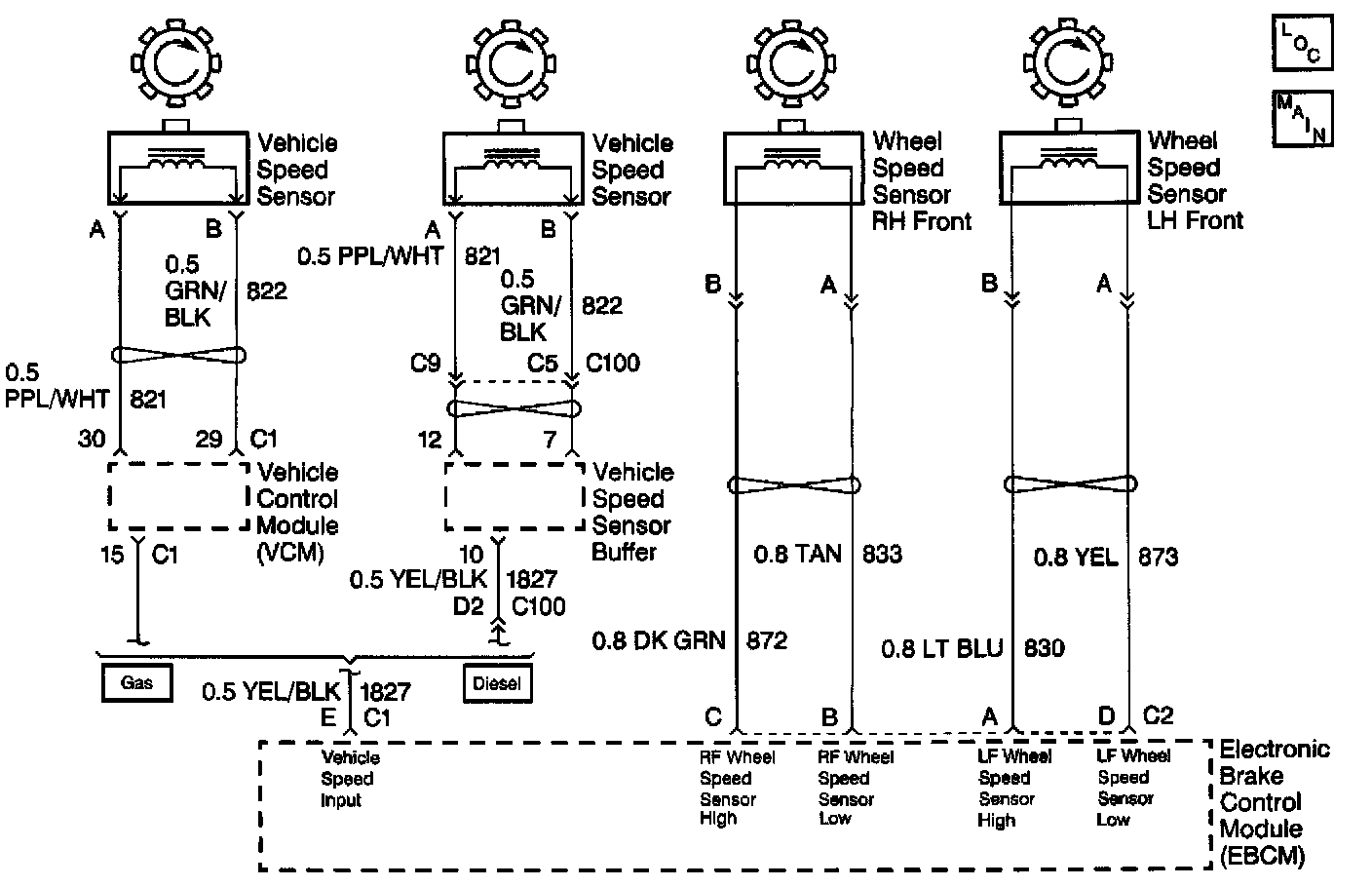 The EBCM receives the rear wheel speed signal from the VCM/PCM. The rear wheel speed signal originates from the Vehicle Speed Sensor (VSS) which is connected to the VCM/PCM.