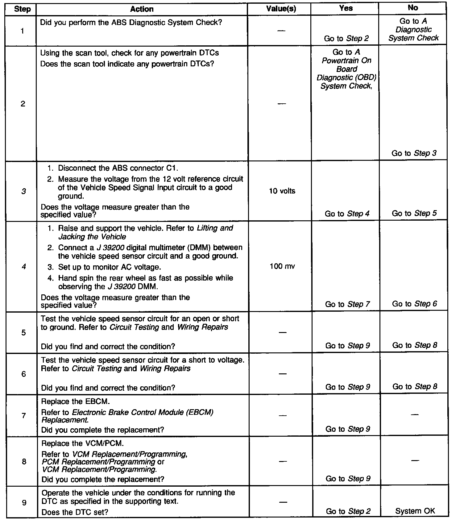 ^ A Condition Latched DTC may exist momentarily, or constantly. In either case, the DTC will be stored in the EBCM memory until the DTC is repaired and/or cleared. After the DTC is repaired and/or cleared and the ignition is turned to ON, the ABS lamp will remain lit until the EBCM completes a power-up self test. This test concludes when the vehicle has reached a speed of greater than 13 km/h (8 mph) and the wheel speed inputs have been checked by the EBCM.