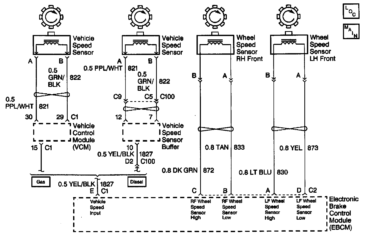 As a toothed ring passes by the wheel speed sensor or vehicle speed sensor, changes in the electromagnetic field cause the speed sensors to produce a sinusoidal (AC) voltage signal. The frequency and amplitude of the sinusoidal (AC) voltage signal are proportional to the vehicle speed. The amplitude of the speed signals are directly related to the distance between the speed sensor coils and the toothed ring. This distance is referred to as the air gap. The EBCM can detect wheel speed signal malfunctions as they happen. An error in reported vehicle speed can be compensated for by the EBCM up to a point. The error compensation will allow the EBCM to continue to function normally instead of setting a DTC. If the vehicle speed mismatch increases beyond that point, the EBCM will set a DTC.