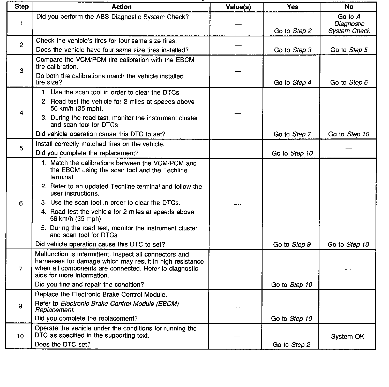 Perform a tire size calibration to ensure that the EBCM calibration matches the installed tire size. Refer to tire size calibration in Scan Tool Diagnostics.