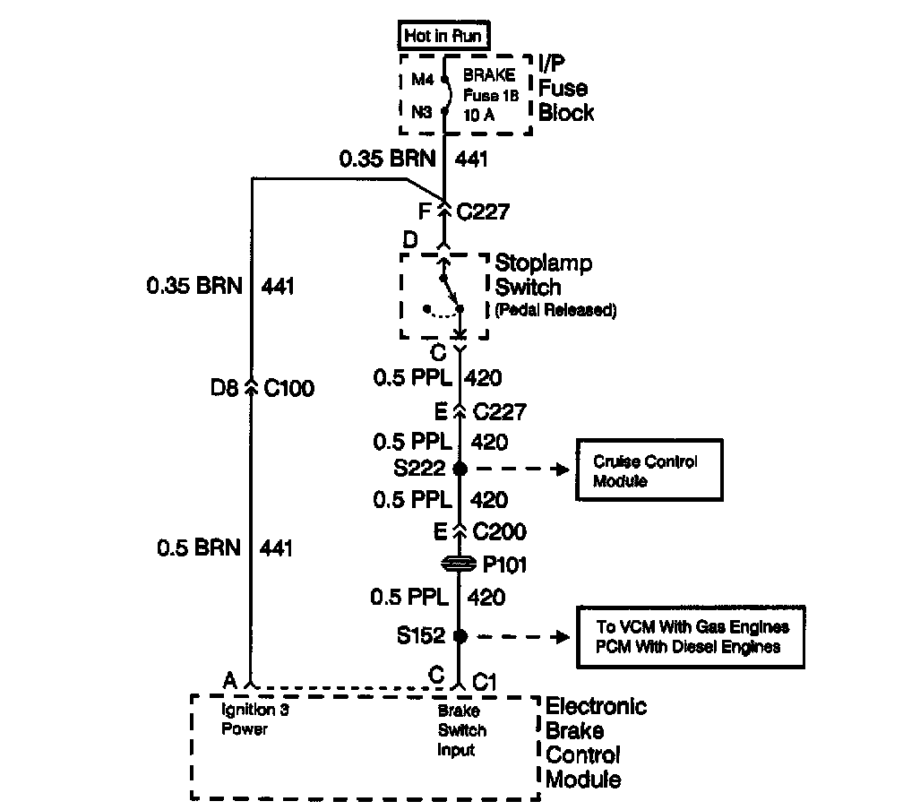 The stoplamp switch is normally closed when the brake pedal is released. With the ignition in the RUN position and the brake pedal released, the EBCM will have ignition voltage present at connector C1 terminal C. When the brakes are applied, the voltage present at terminal C of the EBCM will be zero. The EBCM monitors the status of the stoplamp switch in order to initiate an ABS event, if the right conditions exist. If the stoplamp switch signal is detected at the wrong time, or if it is not detected when the EBCM expects it a DTC C0281 will set.
