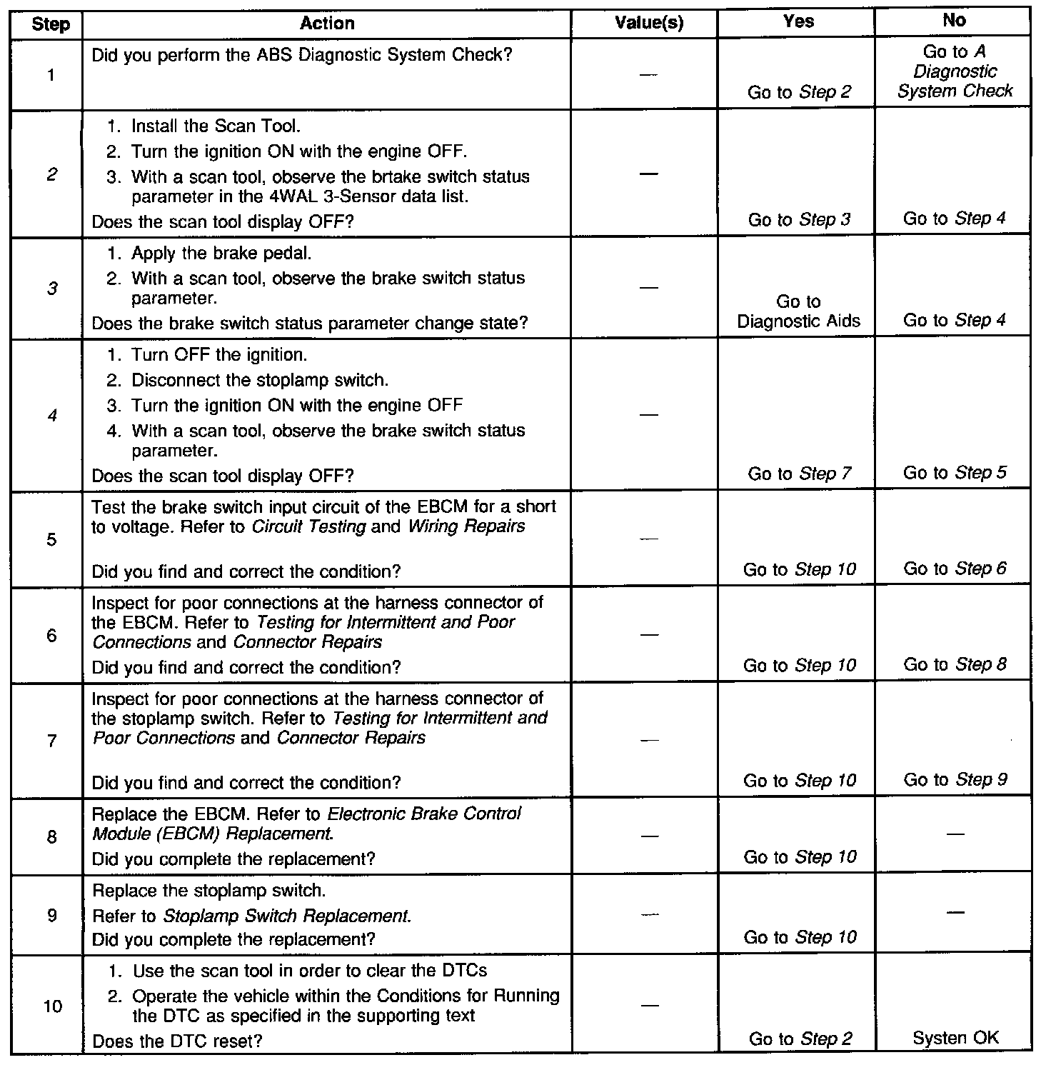 2. Use the scan tool to establish the state of the stoplamp switch input to the EBCM.