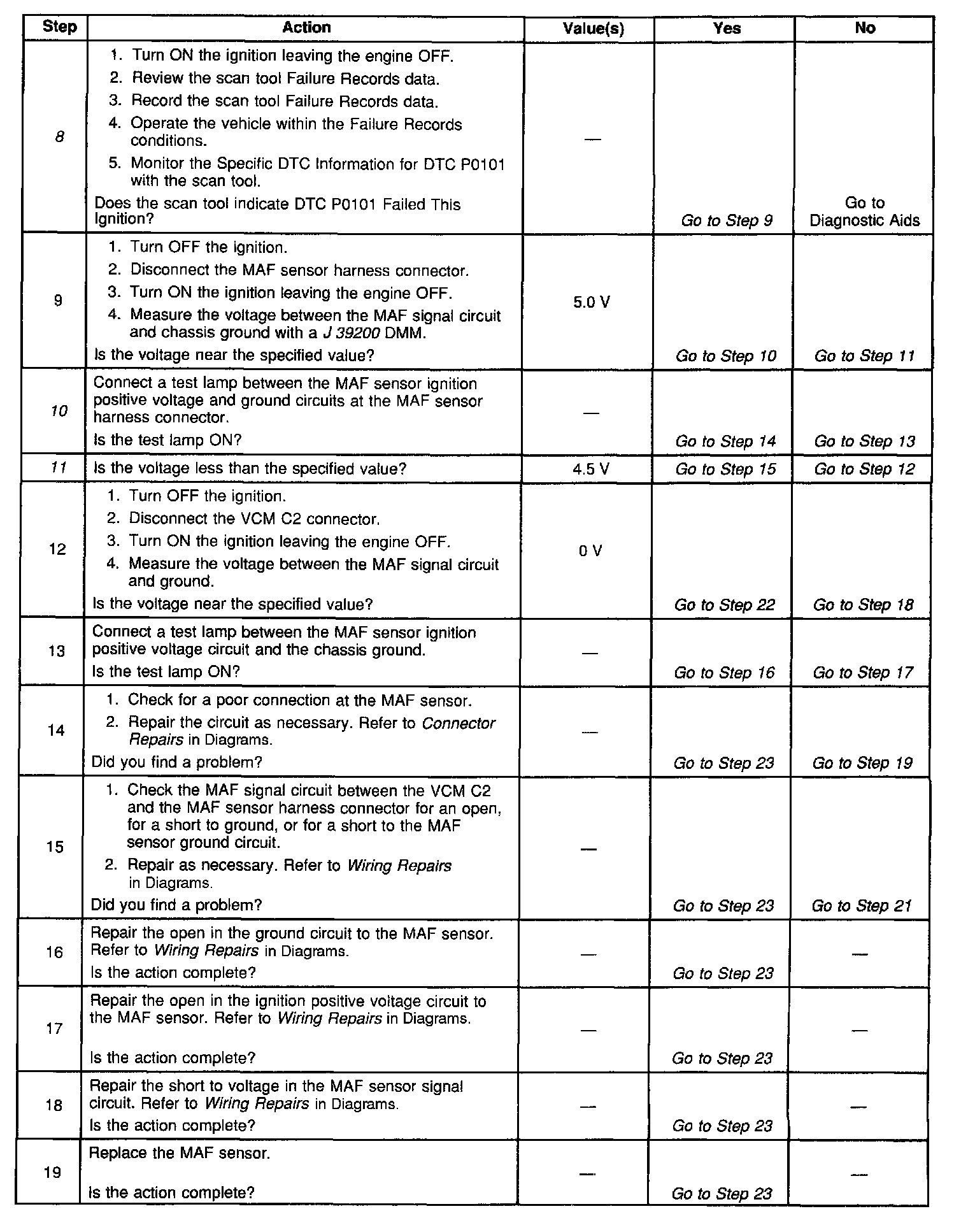 10. A voltage reading of less than 4.0 volts or over 6.0 volts at the MAF sensor signal circuit indicates a fault in the wiring or a poor connection.