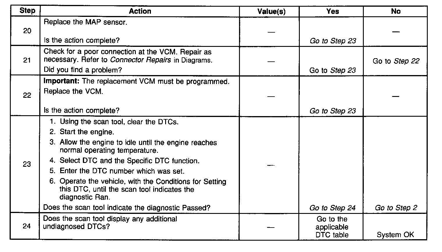 The VCM monitors the MAF sensor air flow rate and compares this signal to a VCM calculated air flow rate. The calculated air flow is based on engine speed and barometric pressure. The VCM uses the MAP sensor in order to determine the barometric pressure when the ignition key is turned ON but before the engine is cranking or running. This DTC will be set if the MAF sensor signal airflow rate does not match the air flow rate calculated by the VCM.