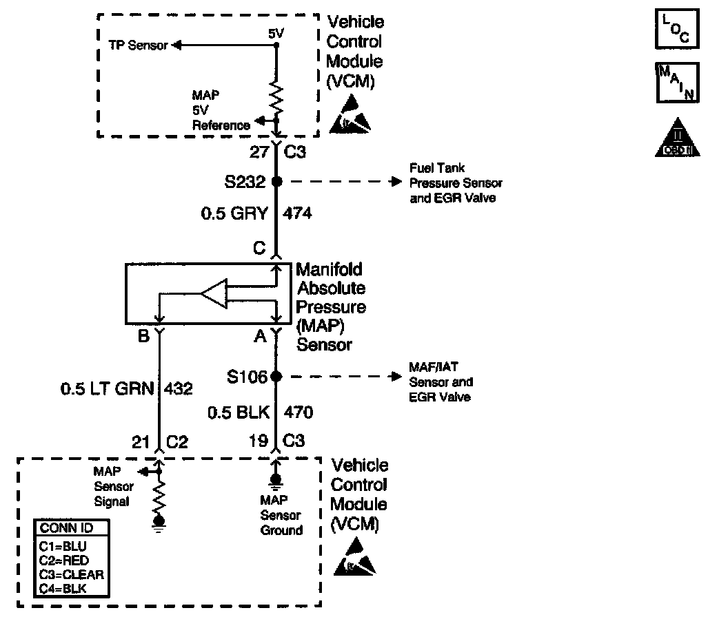 The Manifold Absolute Pressure (MAP) sensor is a pressure sensor. The control module (PCM/VCM) supplies the MAP sensor a reference voltage, signal, and ground circuits. When manifold vacuum is low, the MAP sensor signal voltage rises to a value near the reference voltage, and the MAP sensor signal voltage decreases when the manifold vacuum increases. The control module monitors the MAP sensor signal circuit voltage in order to calculate the vacuum within the intake manifold.