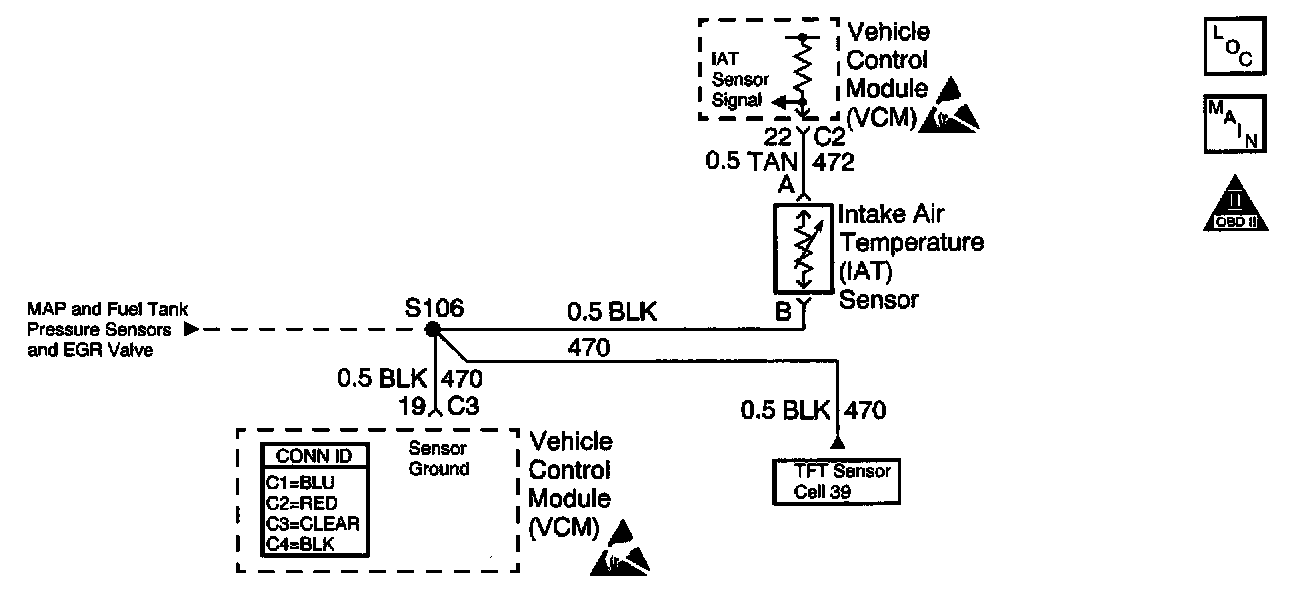 3. This test will bypass the IAT sensor and will confirm that the IAT signal circuit and the sensor ground circuit to the VCM are sound. Grounding the IAT sensor signal circuit will provide a low voltage input to the VCM. The VCM should recognize this low voltage and indicate a high IAT temperature.
