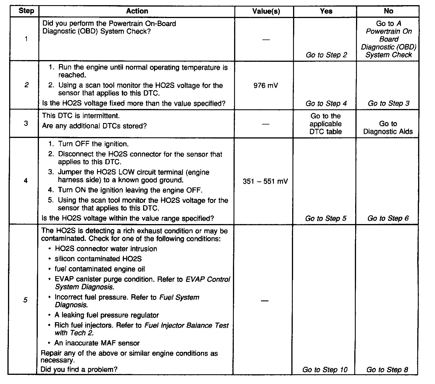 ^ False rich indication due to silicon contamination of the heated oxygen sensor. This DTC, accompanied by a lean driveability conditions and a powdery white deposit on the sensor may indicate a false rich indication.