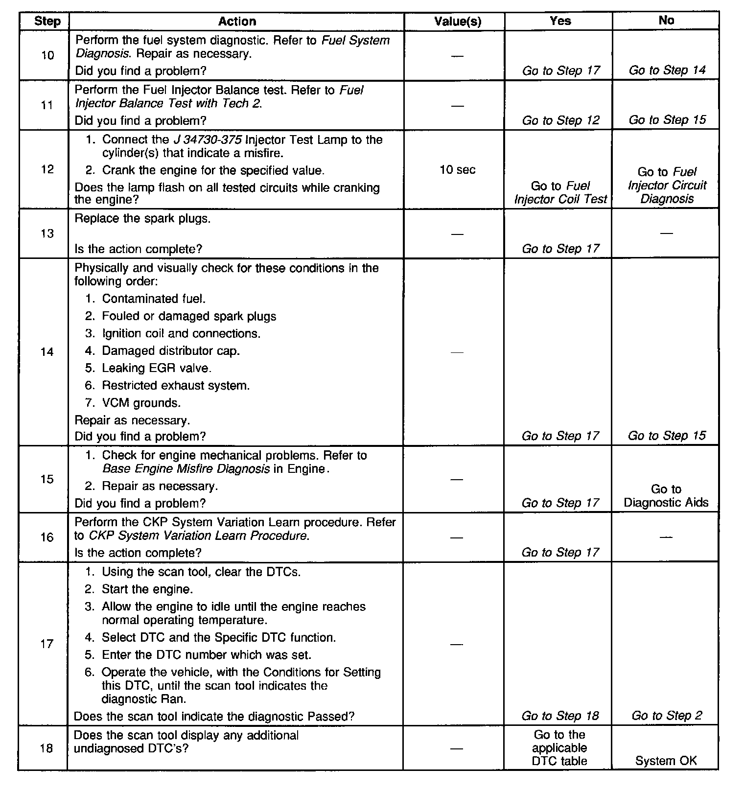 The numbers below refer to the step numbers on the diagnostic table.