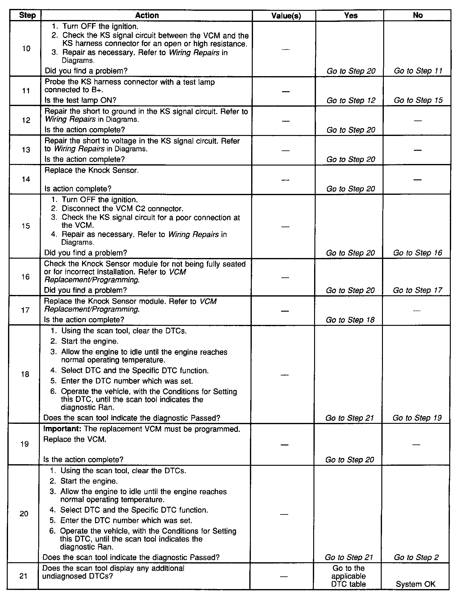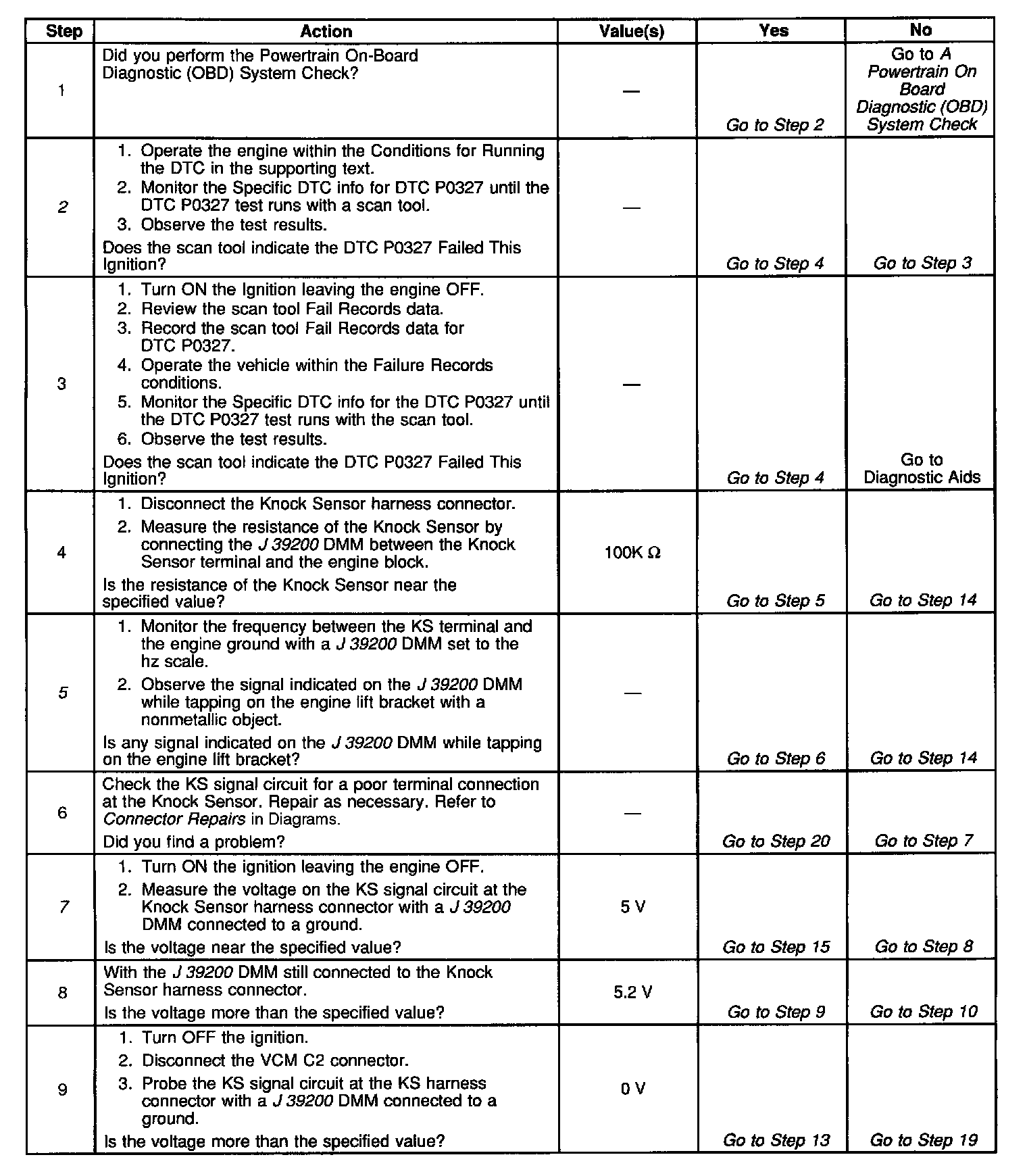The numbers below refer to the step numbers on the diagnostic table.
