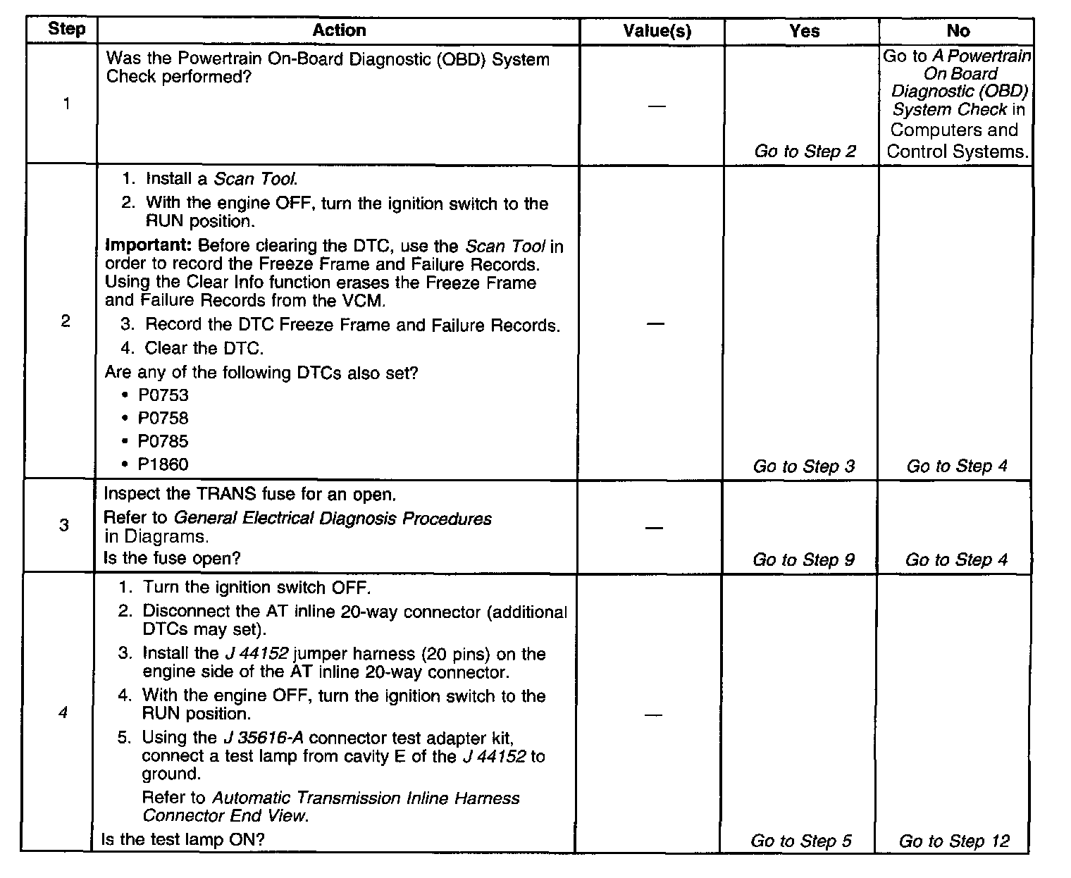 The numbers below refer to the step numbers on the diagnostic table.