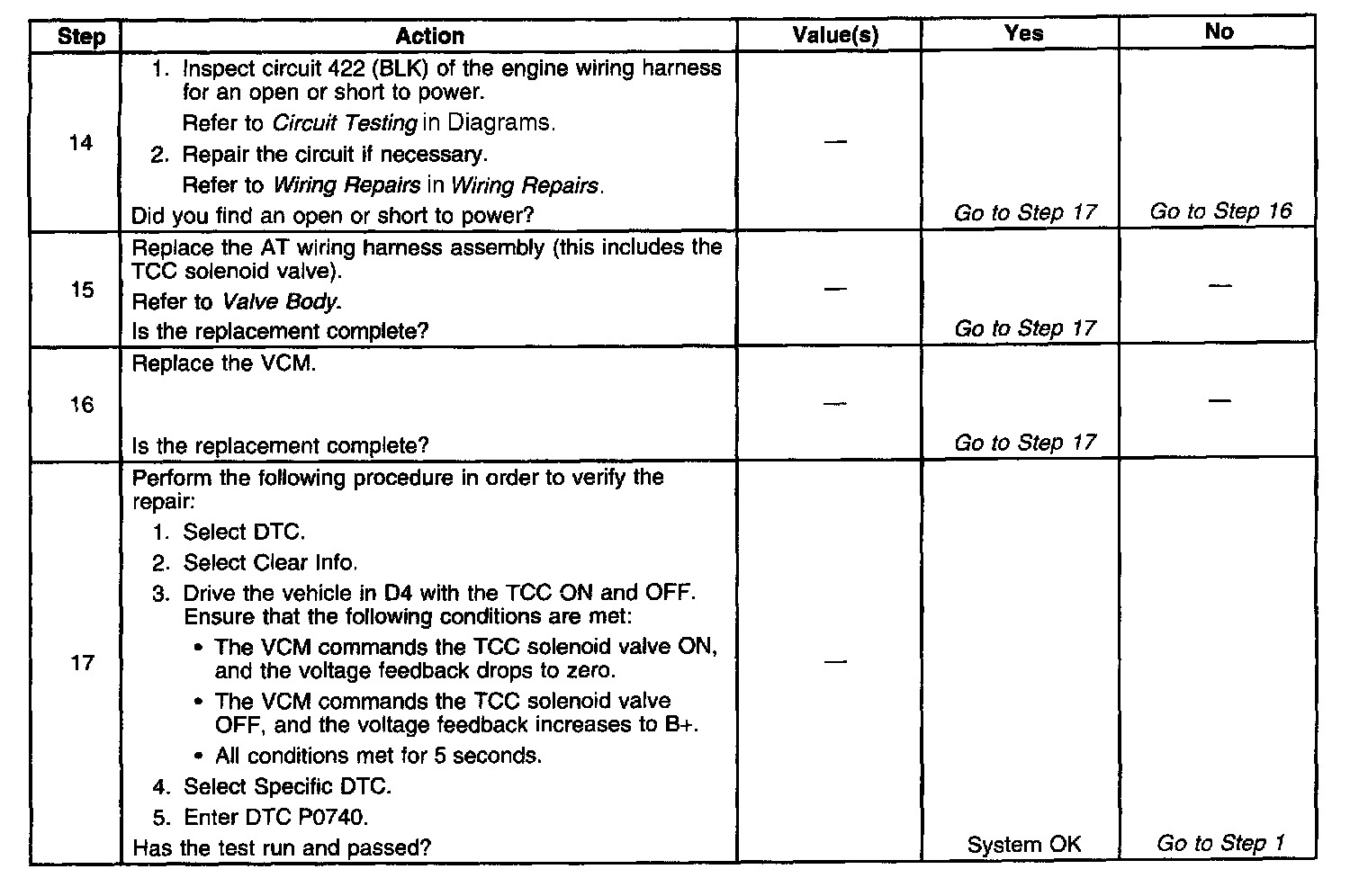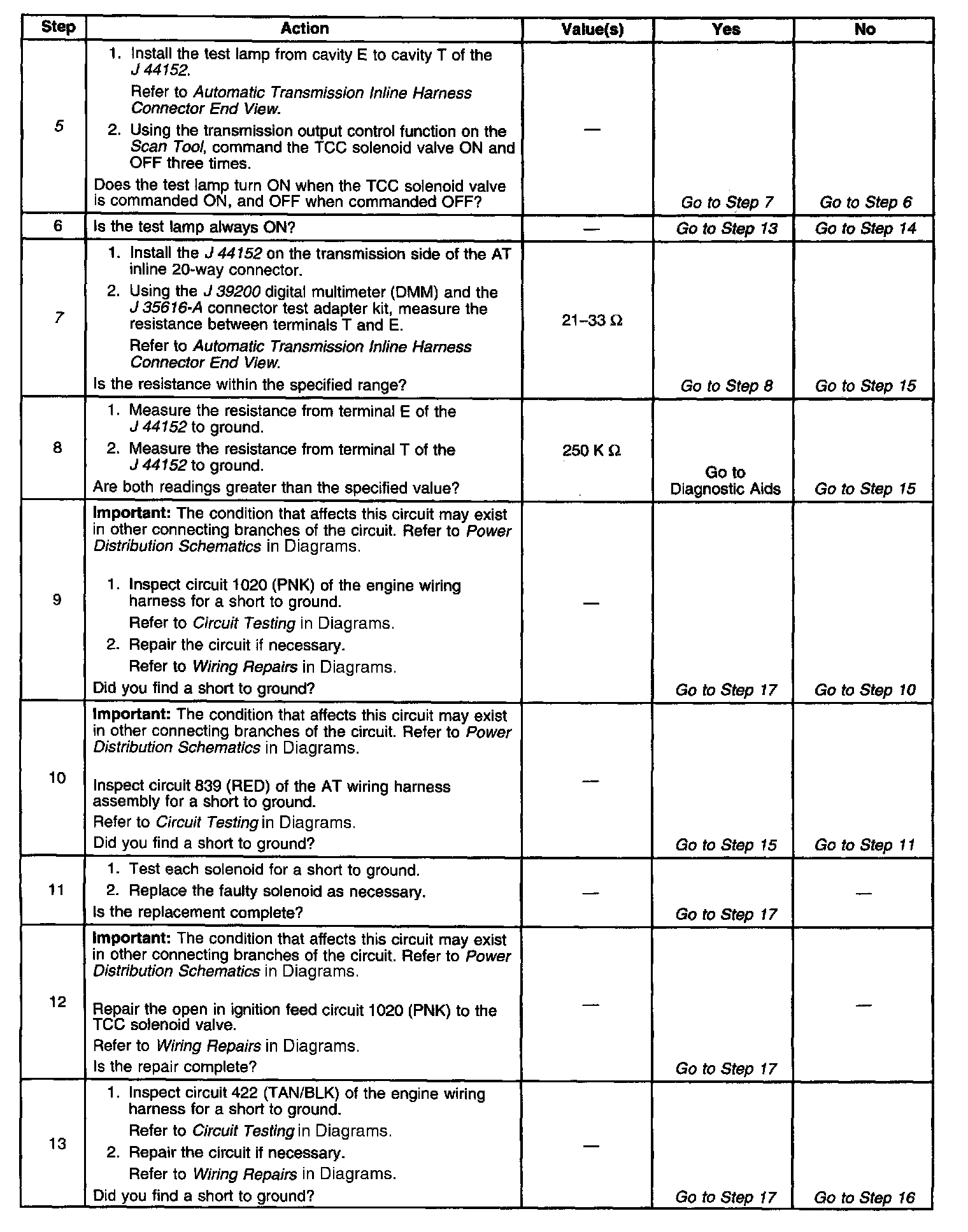 7. This step tests the resistance of the TCC solenoid valve and the Automatic Transmission (AT) wiring harness assembly.