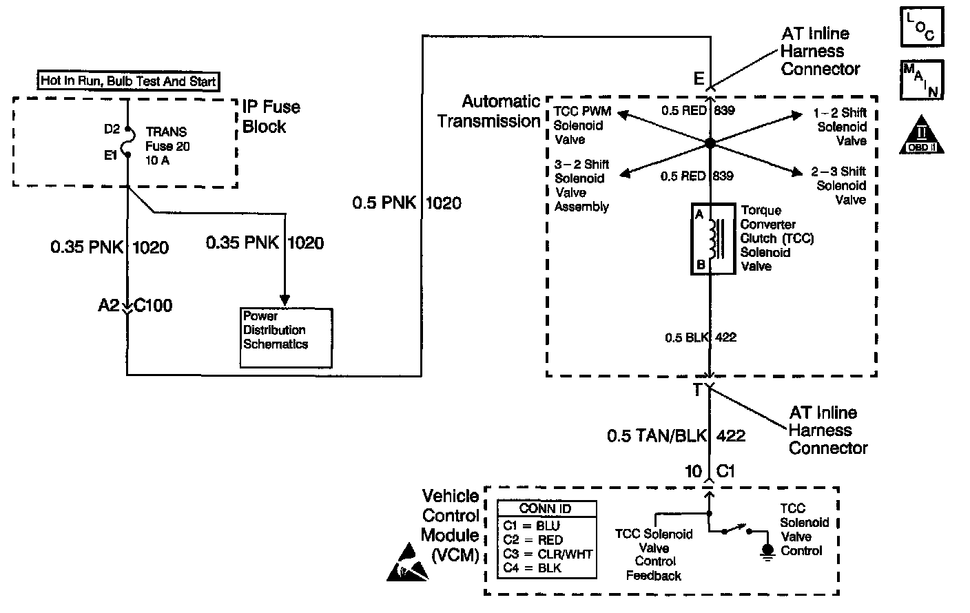 The Torque Converter Clutch (TCC) solenoid valve is an electrical device that is used with the torque converter clutch pulse width modulation (TCC PWM) solenoid valve in order to control TCC apply and release. The TCC solenoid valve attaches to the transmission case assembly extending into the pump cover. The TCC solenoid valve receives ignition voltage through circuit 1020. The Vehicle Control Module (VCM) controls the solenoid by providing the ground path on circuit 422. The VCM monitors the Throttle Position (TP) voltage, the vehicle speed, and other inputs in order to determine when to energize the TCC solenoid valve.