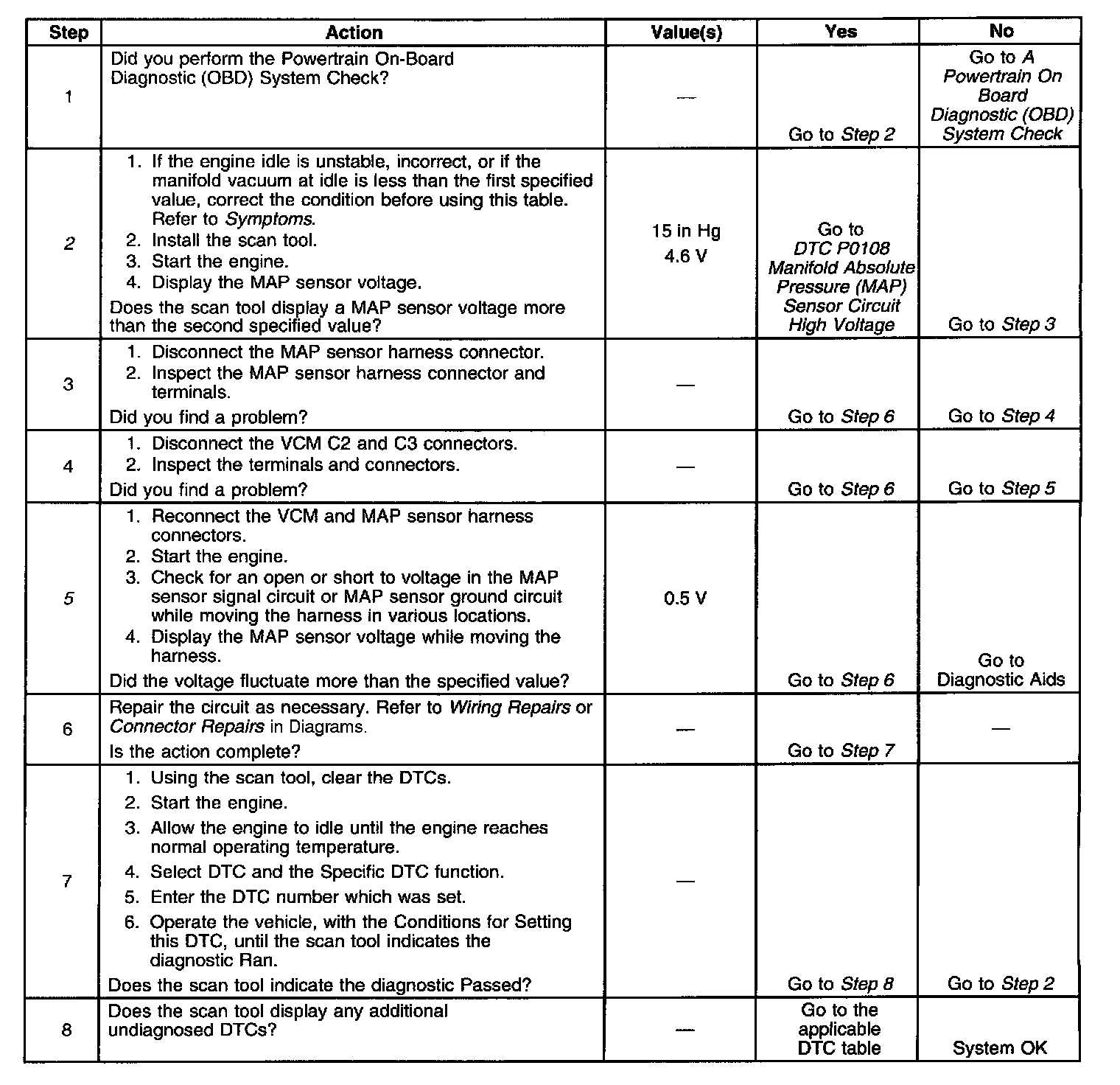 2. If the MAP sensor voltage is more than 4.6 volts then the condition is present. Even though DTC P0108 did not set, this DTC is more comprehensive and may aid in diagnosis.