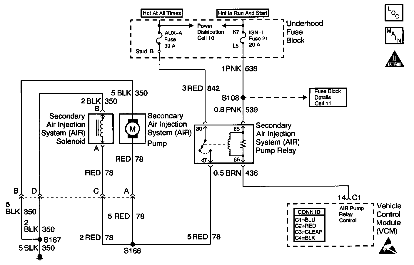 An AIR pump is used on this vehicle to lower tail pipe emissions on start-up. The Vehicle Control Module (VCM) supplies a ground to the AIR pump relay, which energizes the AIR pump and the AIR solenoid.