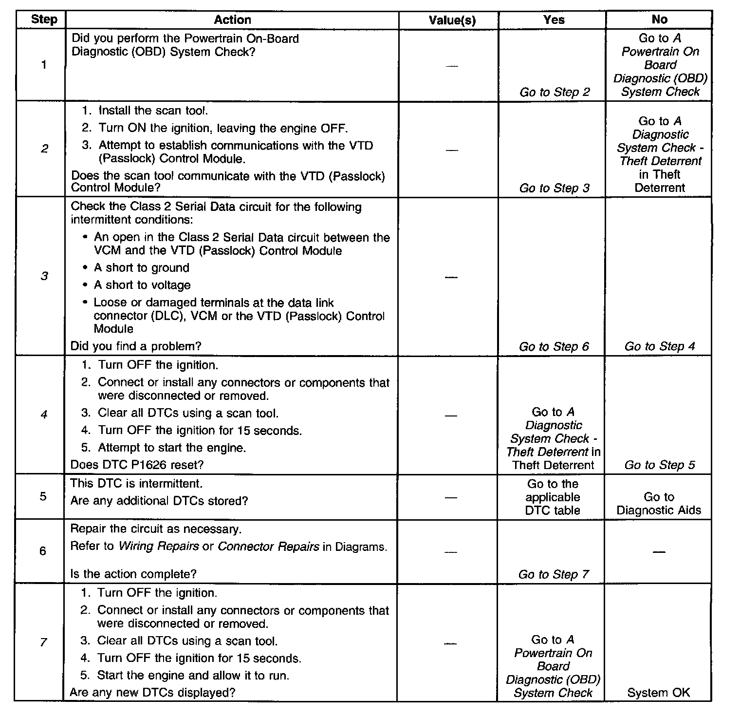 The numbers below refer to the step numbers on the diagnostic table.