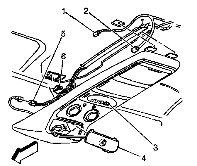 6. Connect the remaining electrical connectors (5 6) from the overhead console to the vehicle.