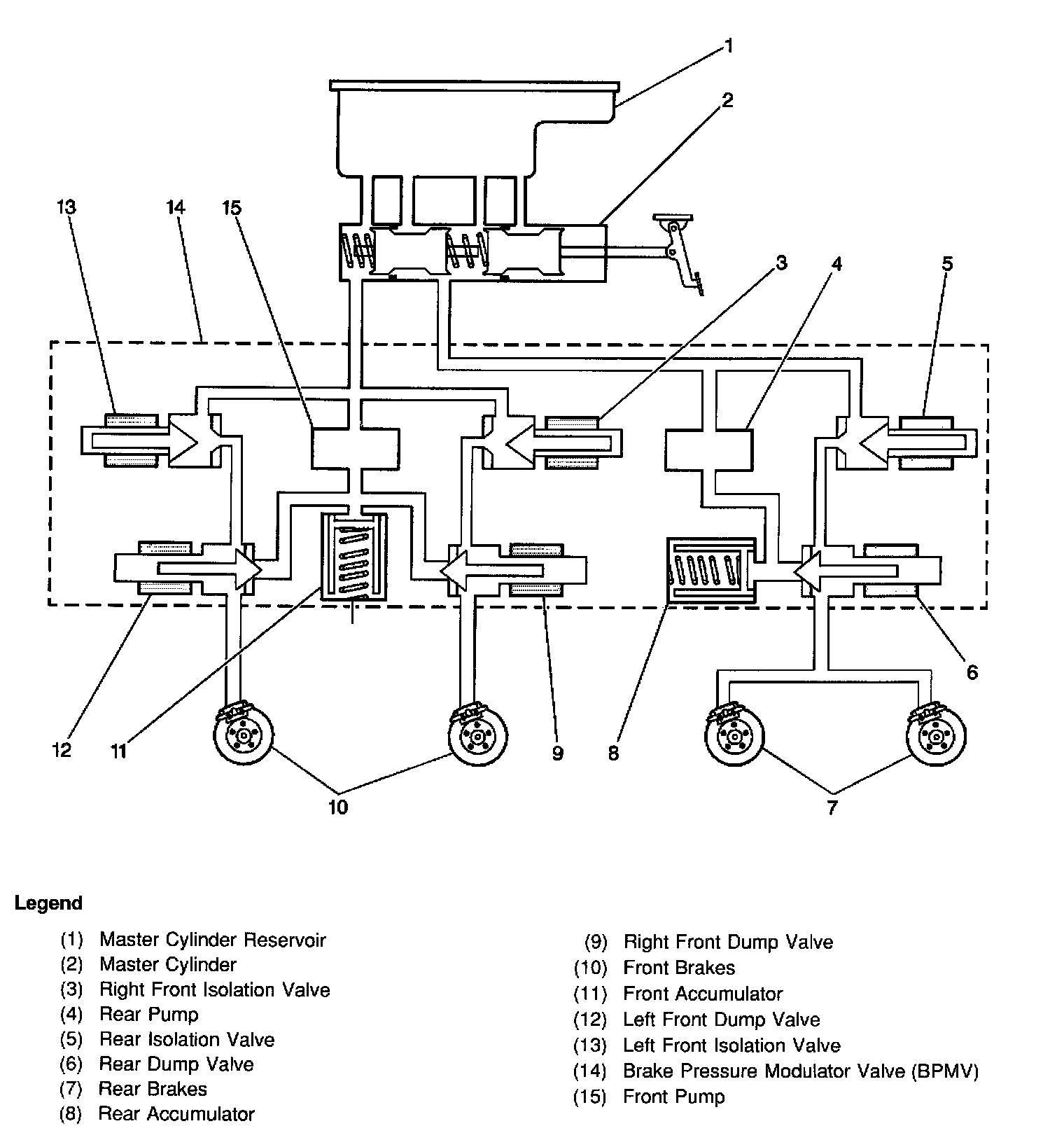 During normal braking, pressure is applied through the brake pedal. Fluid travels from the master cylinder (2), through the combination valve (7) and into the BPMV (19). Once in the BPMV, the fluid travels through the normally open isolation valves (8, 10 and 18), through the normally closed dump valves (11, 14 and 17) and out into the brakes 8 and 11).