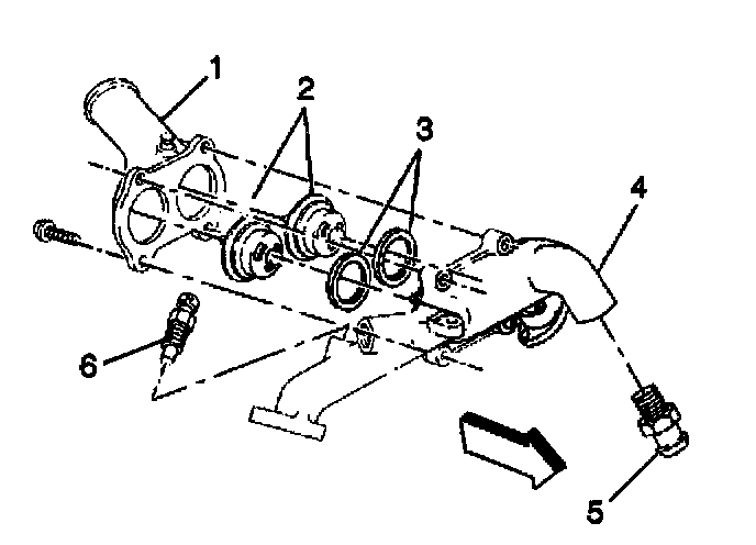 9. Remove the coolant crossover housing assembly (4) from the vehicle. The thermostats (2) and the coolant outlet (1) attach to the crossover housing assembly, along with the thermostat bypass nipple (5).