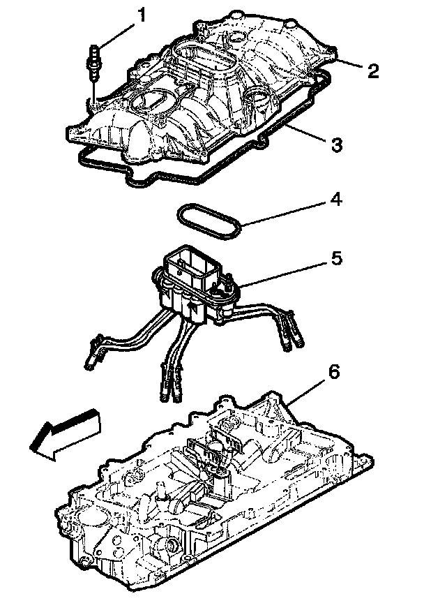 6. Install the upper intake manifold (2) onto the lower intake manifold (6).