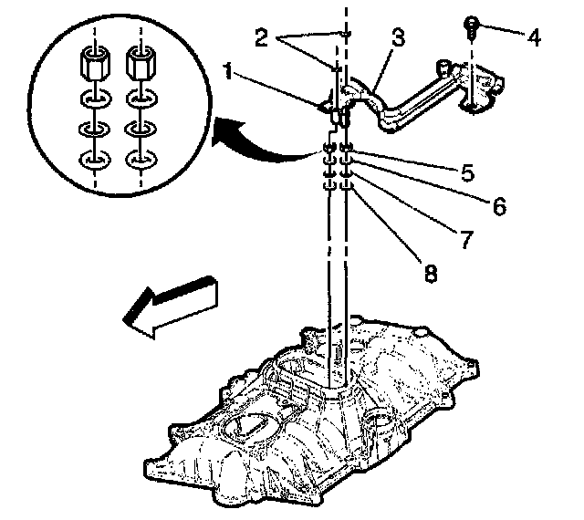 1. Install the fuel meter body (5) into the lower intake manifold (6).