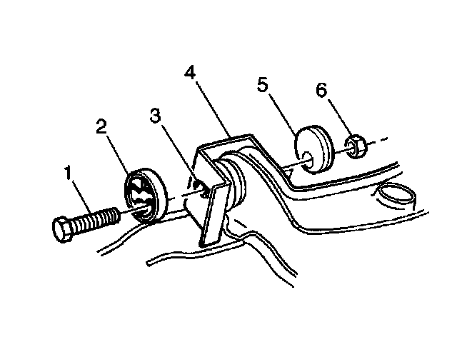 2. Install the bolts (1) and the cams (6) through the frame brackets (2) and through the control arm (3).