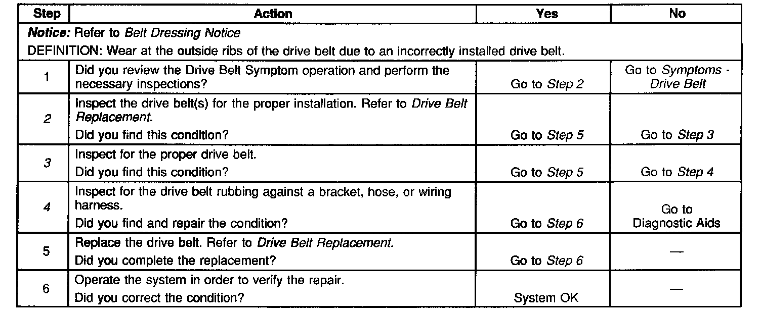 2. The inspection is to verify the drive belt(s) is correctly installed on all of the drive belt pulleys. Wear on the drive belt(s) may be caused by mis-positioning the drive belt(s) by one groove on a pulley.
