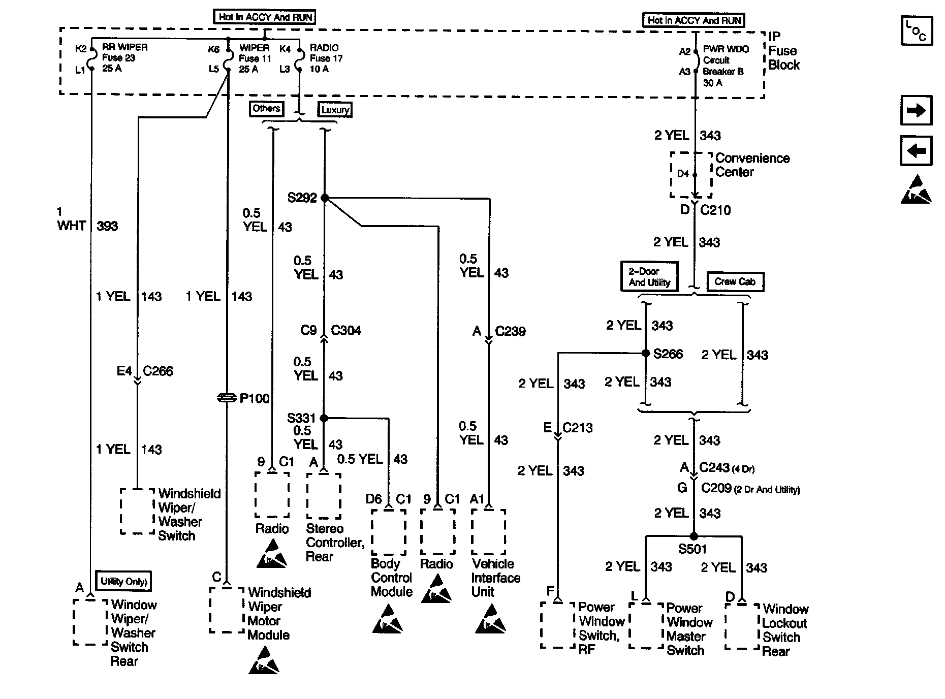 Power Distribution Schematics: RR WIPER, WIPER, RADIO, and PWR WDO Circuit Breaker: