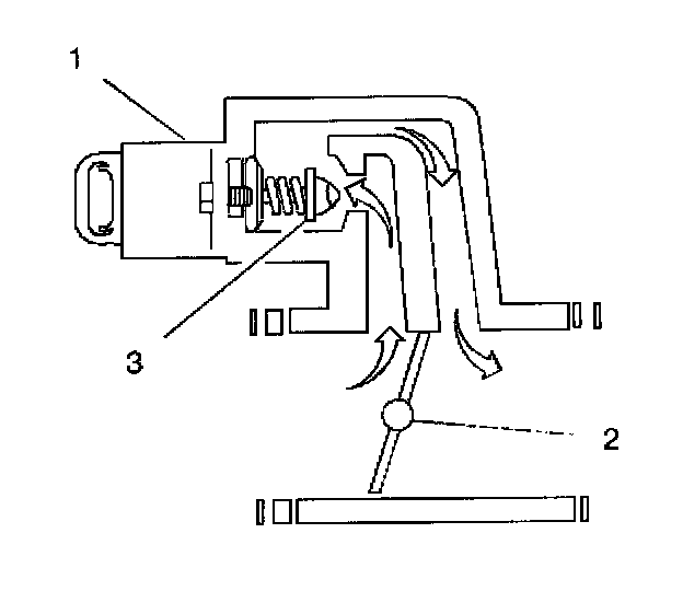 The purpose of the IAC valve assembly is to control the engine idle speed while preventing engine stalls due to changes in the engine load. The IAC valve (1), mounted in the throttle body assembly, controls the bypass air around the throttle valve (2). By moving a conical valve known as a pintle (3) in toward the seat, in order to decrease the air flow, or out away from the seat, in order to increase the air flow, a controlled amount of air moves around the throttle valve. If the engine speed is too low, more air is bypassed around the throttle valve in order to increase the RPM. If the engine speed is too high, less air is bypassed around the throttle valve in order to decrease the RPM. The control module moves the IAC valve in small steps, called counts. These can be displayed by a scan tool, which plugs into the data link connector (DLC).