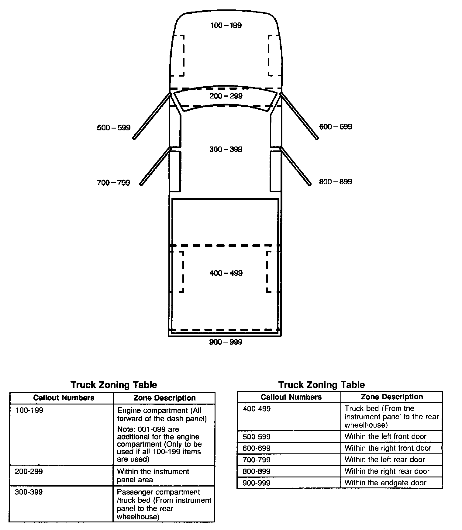 All grounds, in-line connectors, pass-through grommets, and splices have identifying numbers that corresponds to where they are located in the vehicle. The following table explains the numbering system.