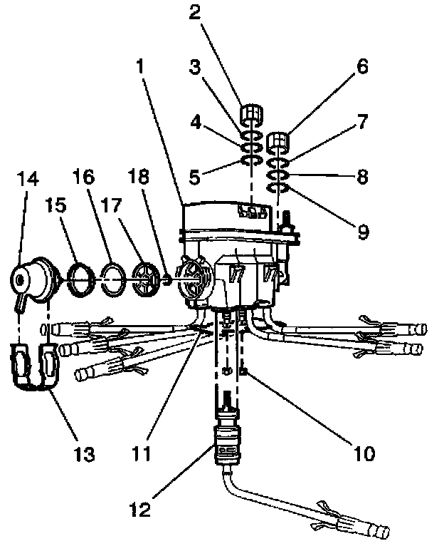 5. Pull and twist the fuel pressure regulator (14) in order to remove the fuel pressure regulator from the fuel pressure regulator housing using a shop towel to catch any spilled fuel.