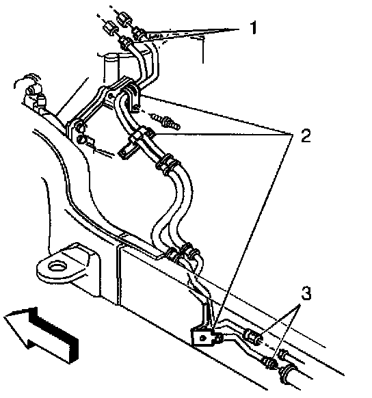3. Disconnect the fittings (1) at the engine compartment fuel feed and return pipes.