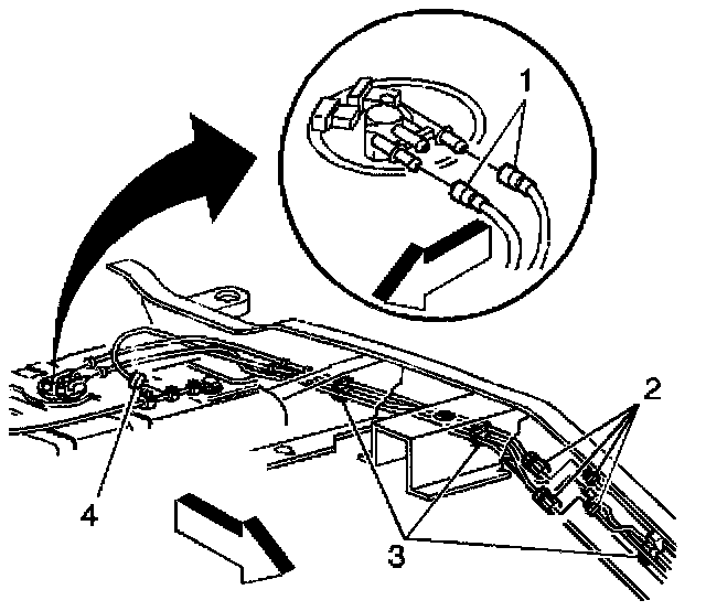 7. Connect the quick-connect fittings at the fuel feed and return pipes (1) and the vapor pipes (4) at the fuel sender assembly.