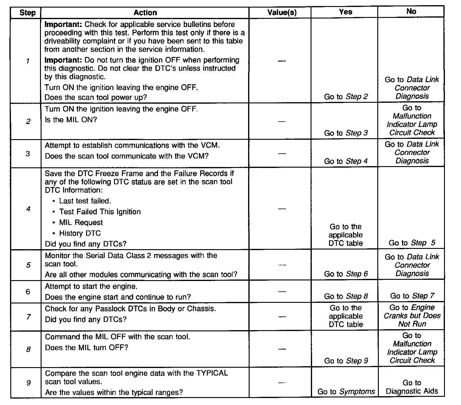 Understanding the table properly reduces the diagnostic time. Proper use of the OBD System Check helps prevent the unnecessary replacement of good parts.