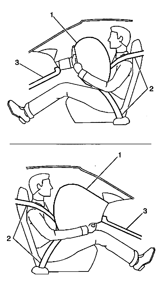 The Supplemental Inflatable Restraint (SIR) system supplements the protection offered by the driver and front passenger seat belts (2). The SIR system deploys an air bag (1) from the center of the steering wheel and from the right side of the instrument panel.