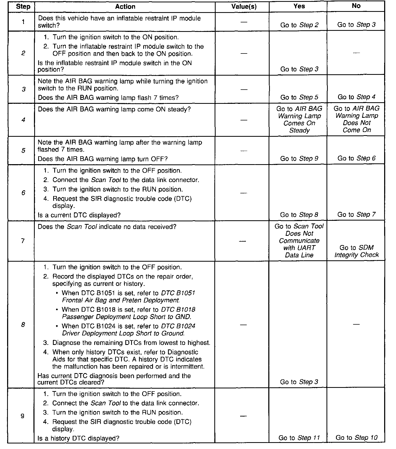 1. Refer to the diagnostic table as directed by the Diagnostic System Check - SIR. The diagnostic tables will assist you in diagnosing any SIR system malfunction.