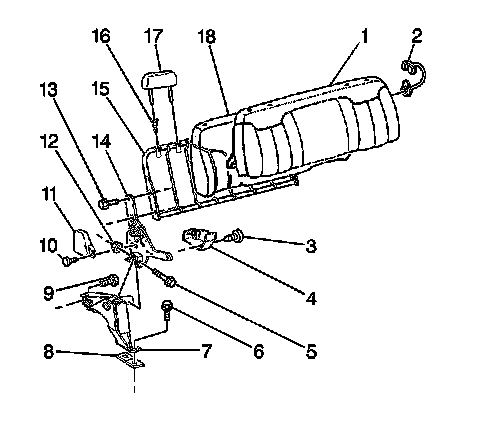2. Insert a paper clip or a similar tool into the hole at the forward edge of the head restraint retainer (16).