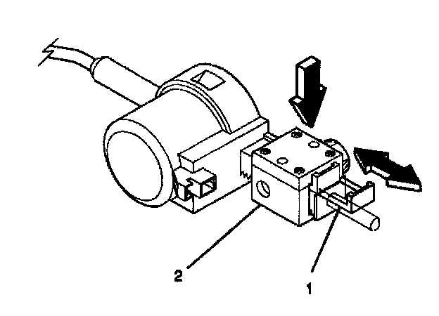 2.1. Pull out the tab (1) on the adjuster block side (2) of the electrical automatic transmission shift lock control actuator.