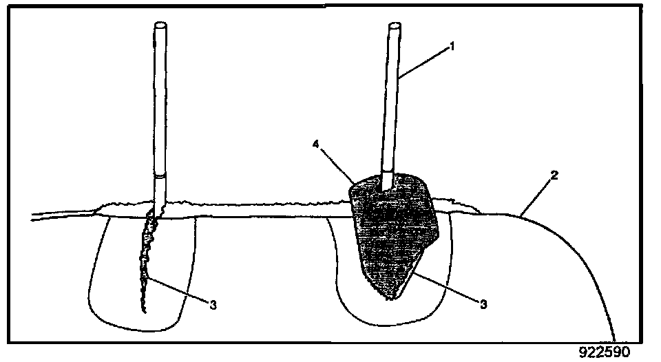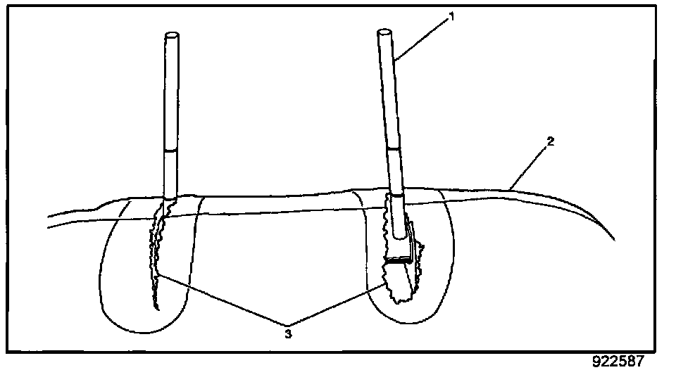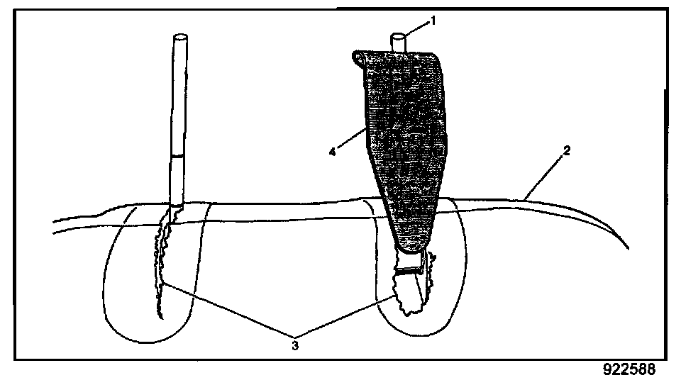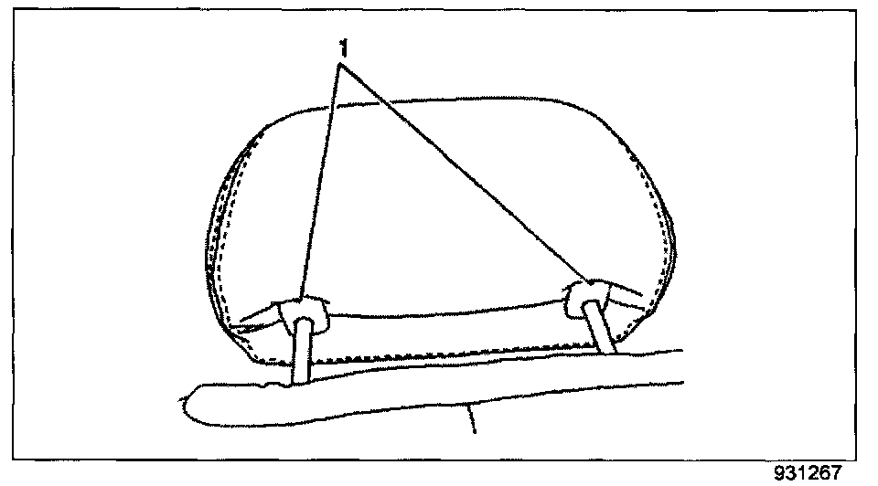 4. Insert an awl or pointed tool into the small hole (1) in the retainer located at the bottom of the head restraint while slightly pulling upward on the restraint. Repeat this step on the second support of the head restraint.